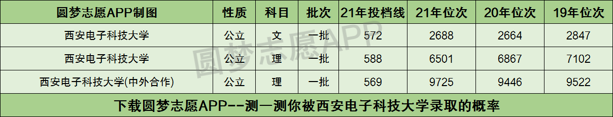 根据上图可知,西安电子科技大学2021年在陕西省本科一批文科的投档分数线为572分,理科投档分数线为588分;西安电子科技大学(中外合作)在陕西理科的投档分数线为569分。
