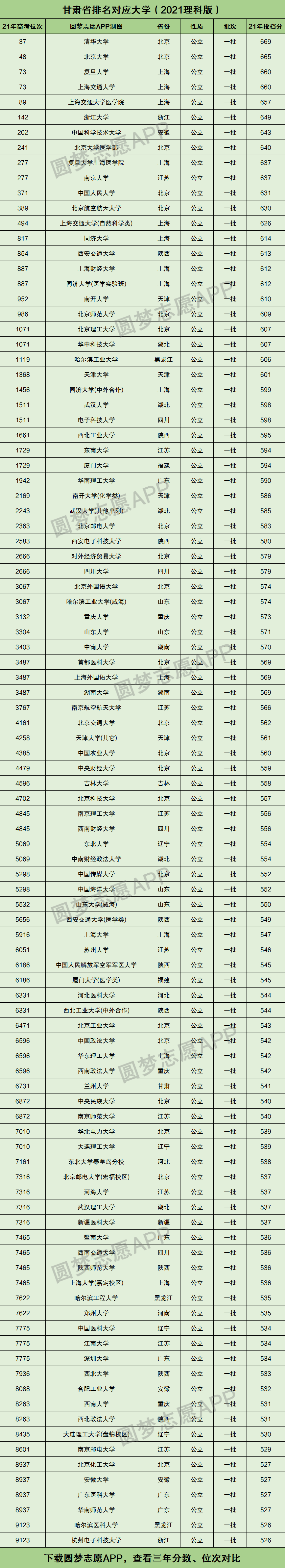 根据甘肃省教育考试院公布的全国大学2021年在甘肃省高考理科的最低投档分数线及位次,为大家整理出了录取位次最高的前100所大学。