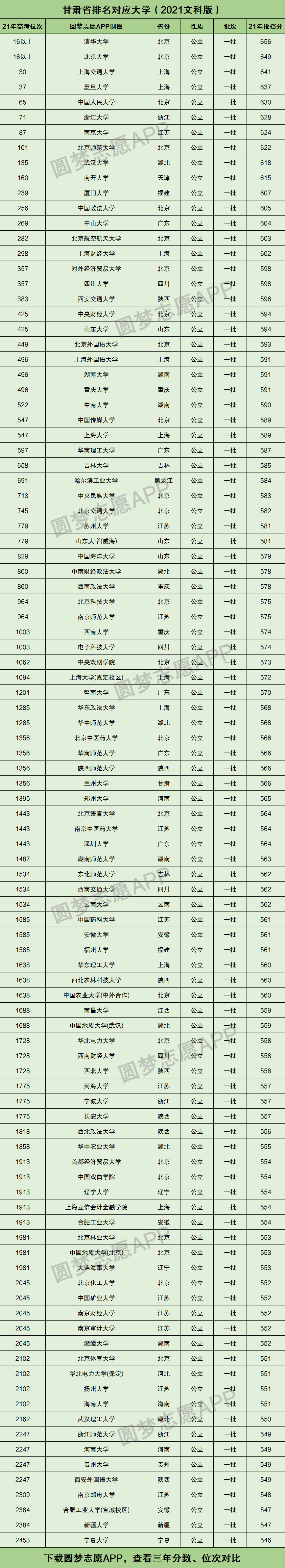 下图为2021年高考甘肃文科录取位次最高的前100所大学的具体名单,其对应的文科位次为全省前2453名。