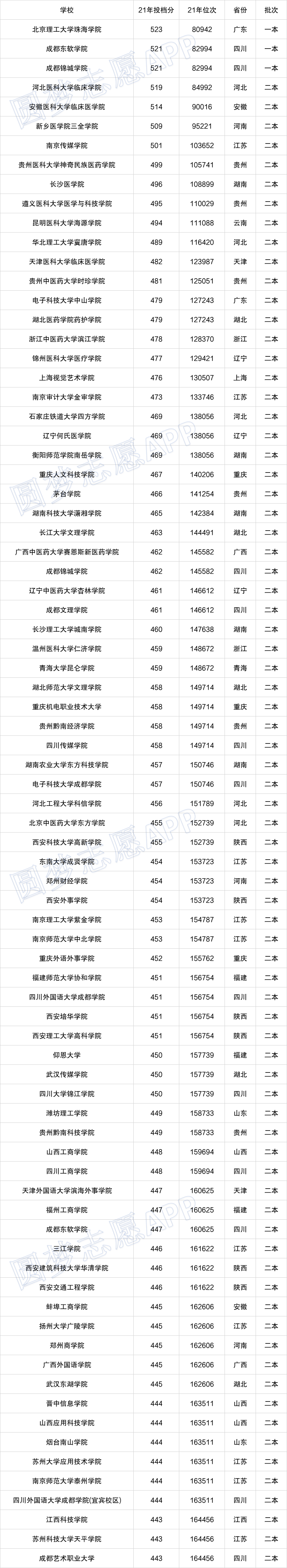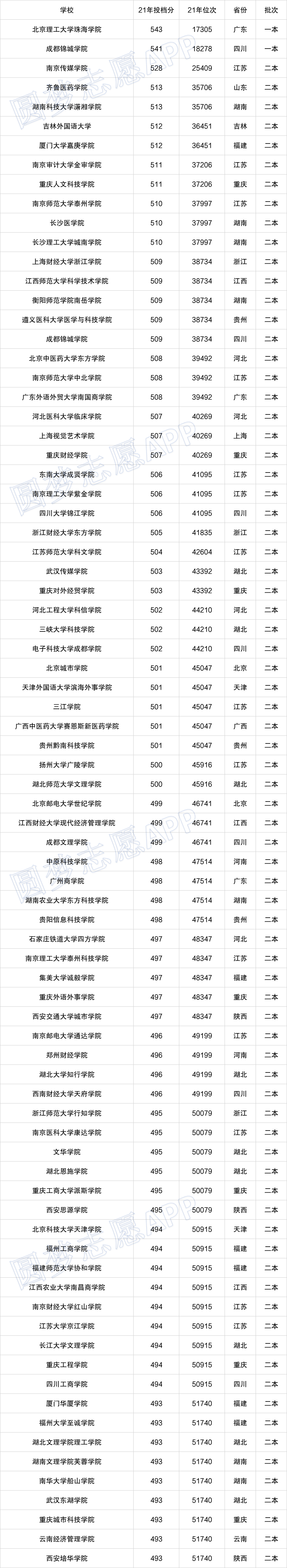 一.2022全国民办大学录取分数线排名