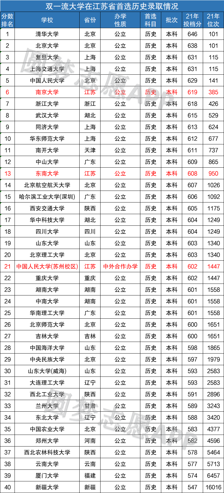 在江苏省内历史科目组中录取的双一流有3所,分别为南京大学(619分)、东南大学(608分)、中国人民大学(苏州校区)(602分)。