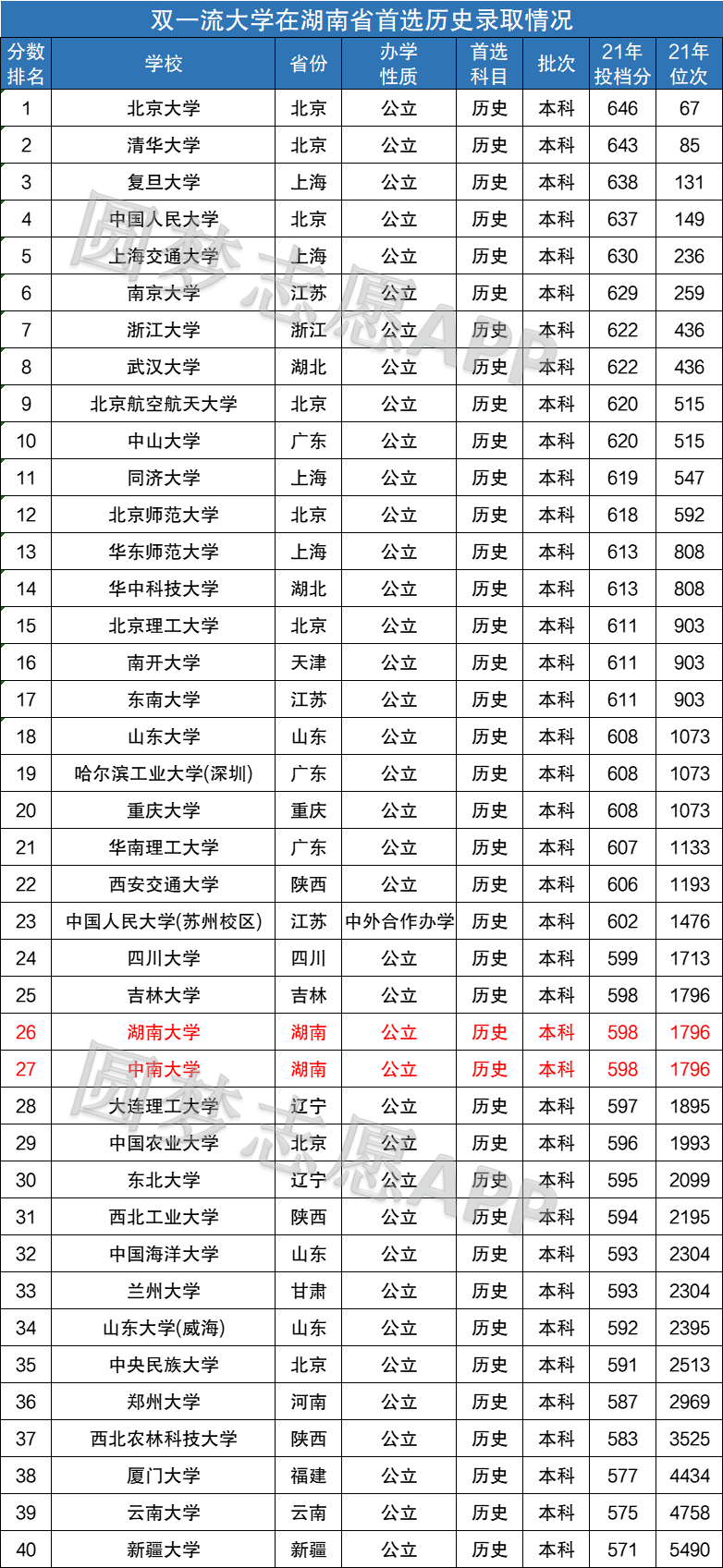 在湖南省内历史科目组中录取的双一流有2所,分别为湖南大学(598分)、中南大学(598分)。