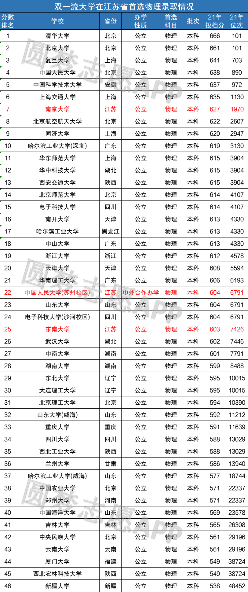 在江苏省内物理科目组中录取的双一流有3所,分别为南京大学(627分)、中国人民大学(苏州校区)(604分)、东南大学(603分)。
