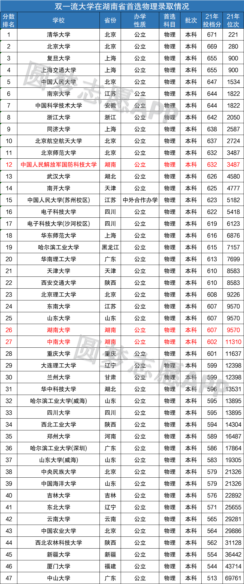 在湖南省内物理科目组中录取的双一流有3所,分别为中国人民解放军国防科技大学(632分)、湖南大学(607分)、中南大学(602分)。
