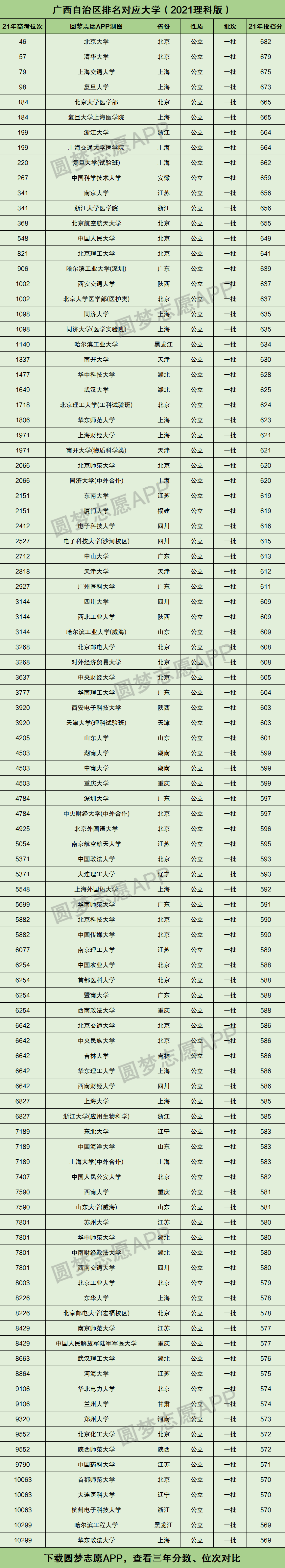 通过这份资料,我们可以清楚知晓2021年广西高考理科成绩排在全区前10299名的同学,最终都分别被哪些好大学给录取了!