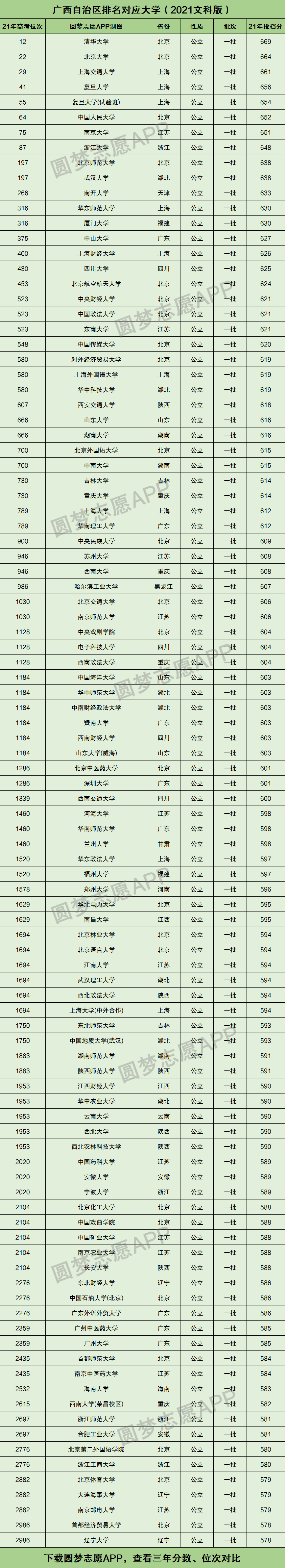 下图为2021年高考广西文科录取位次最高的前100所大学的具体名单,其对应的文科位次为全区前2986名。