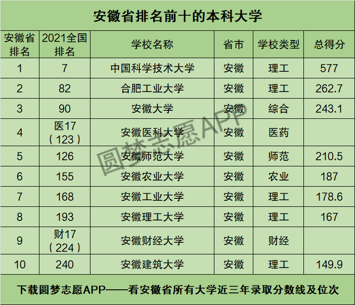 下图中,为大家整理了安徽省排名前十的本科大学的全国排名以及总得分情况。
