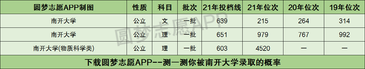 根据上图可知,南开大学2021年在陕西省本科一批文科的投档分数线为639分,理科投档分数线为651分;南开大学(物质科学类)在陕西理科的投档分数线为603分。