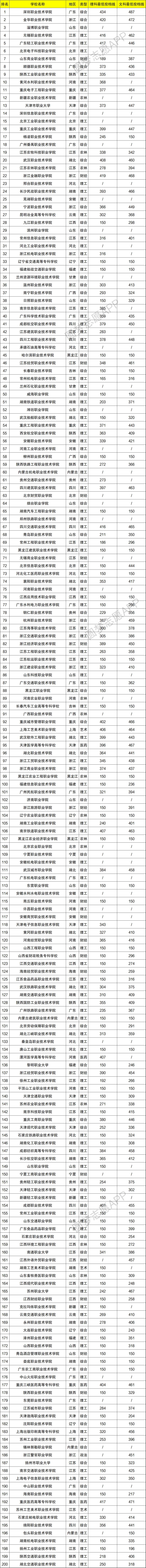 结合中国科教网发布的2021-2022年中国高职高专院校竞争力排行榜和2021年四川省教育考试院公布的专科院校录取数据,下表是全国排名前200的专科院校名单和文理科分数线。