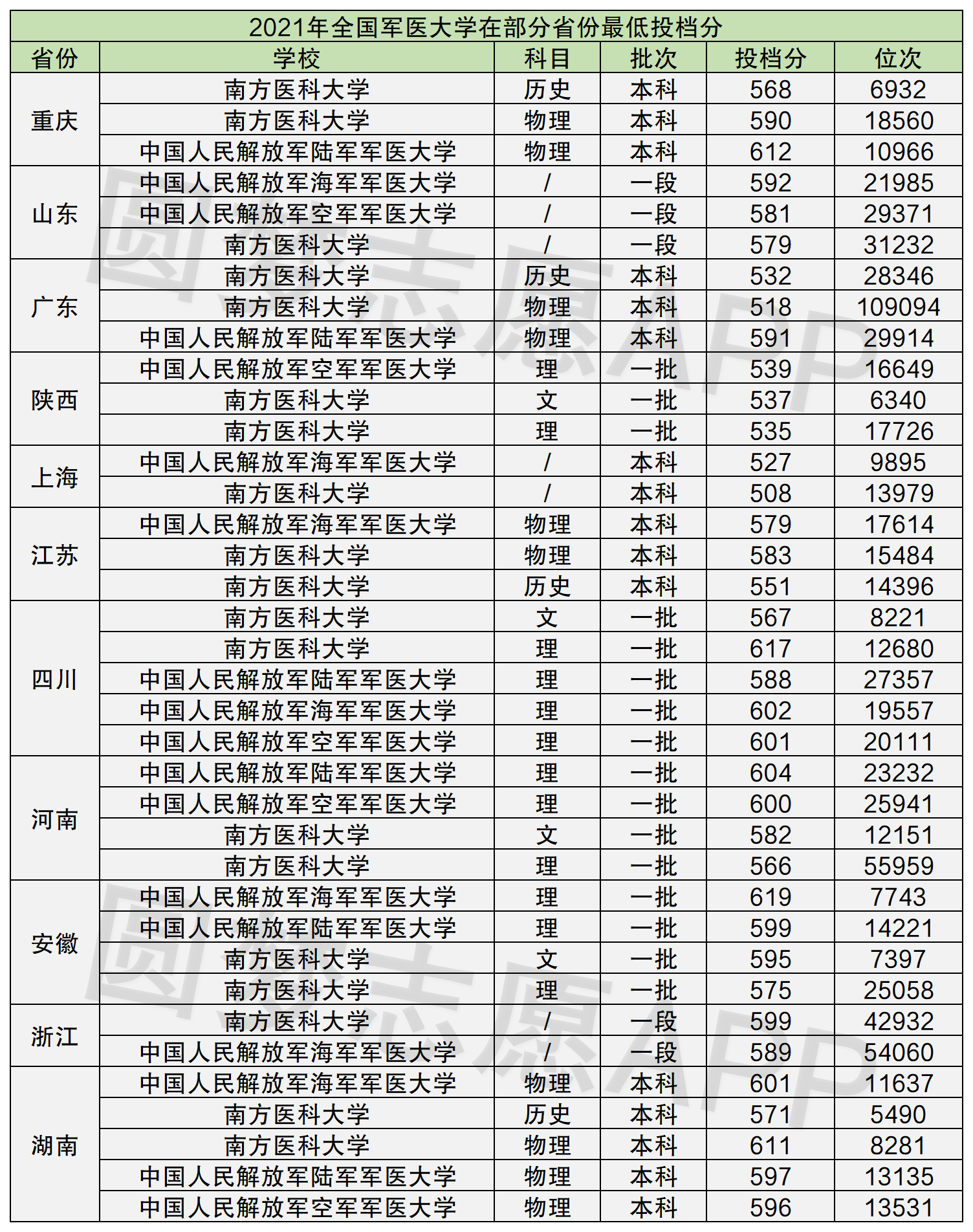军事类院校的分相关信息一般不对外公布,因此很多省份的分数线查询不到,小编这里整理了2021年这四所大学在部省份的最低投档分供大家参考。