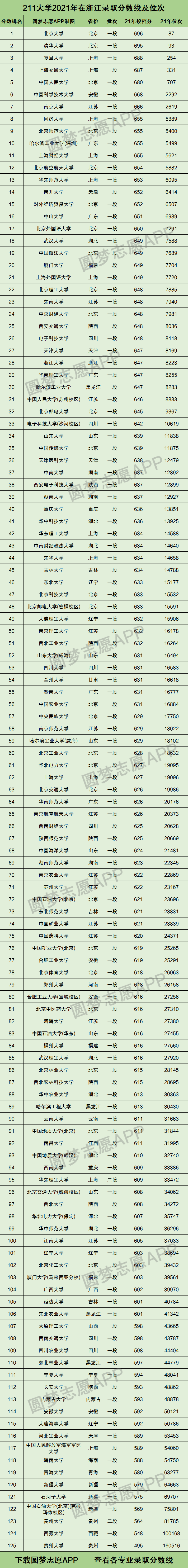 一、2021年211大学在浙江录取位次