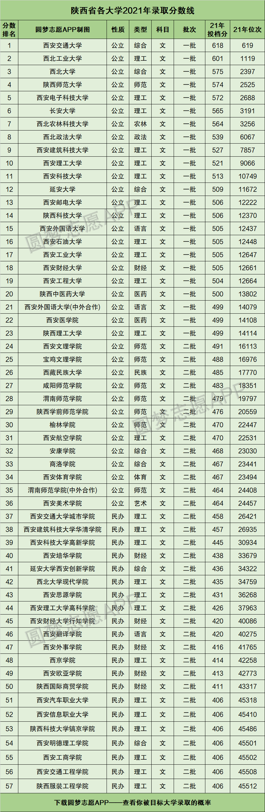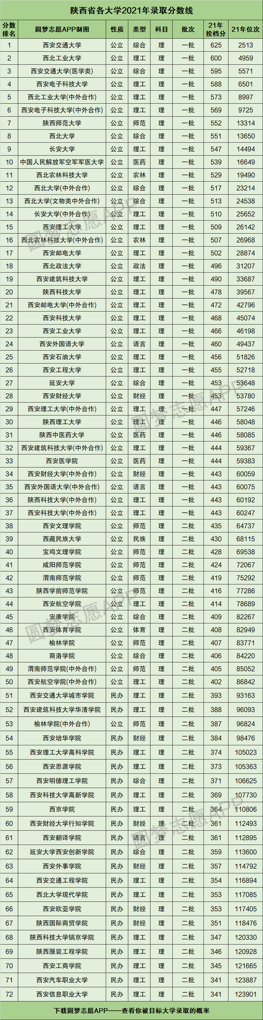 陕西省内各个大学2021年最新录取分数线排名,是每一位陕西省即将参加2022年高考的同学所必备的资料。本文将为大家奉上这份数据,希望陕西省内的每一位高三同学都能圆梦大学、被陕西省内的好大学录取!