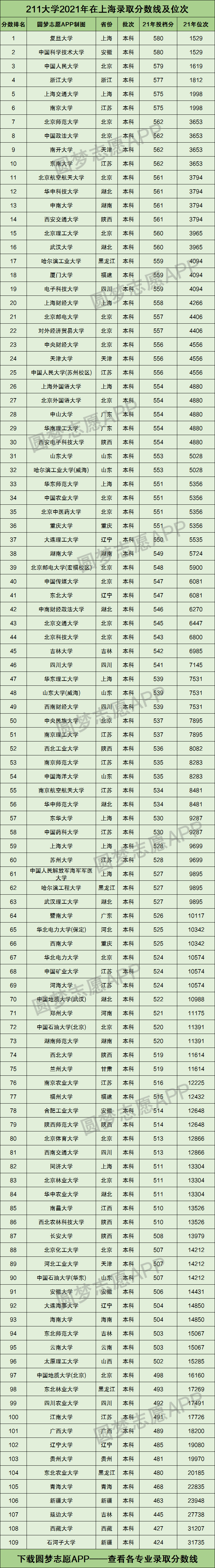 下图为全国211大学在上海的录取分数线及位次排名,以位次高低为标准,进行的排序: