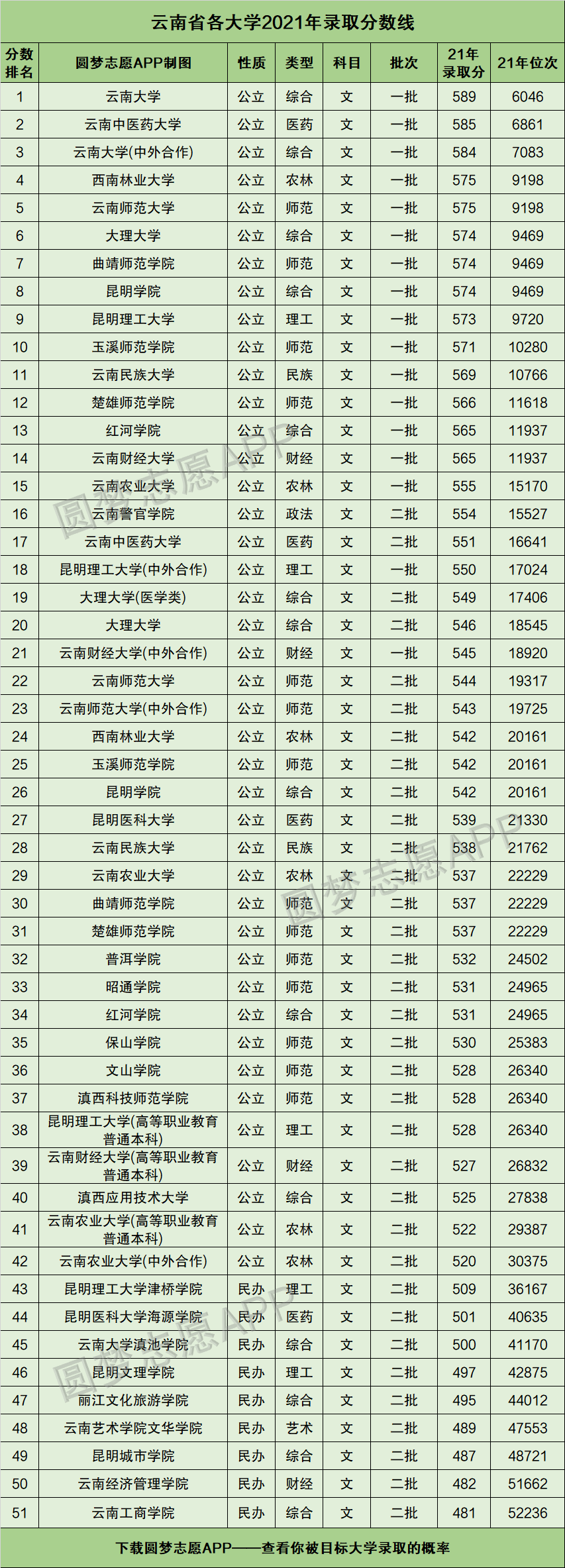 根据云南省招生考试院公布的2021年高考招录数据,为同学们整理出了云南省内的所有本科大学在文科考生中的最低录取分数线及位次排名。具体可见下图: