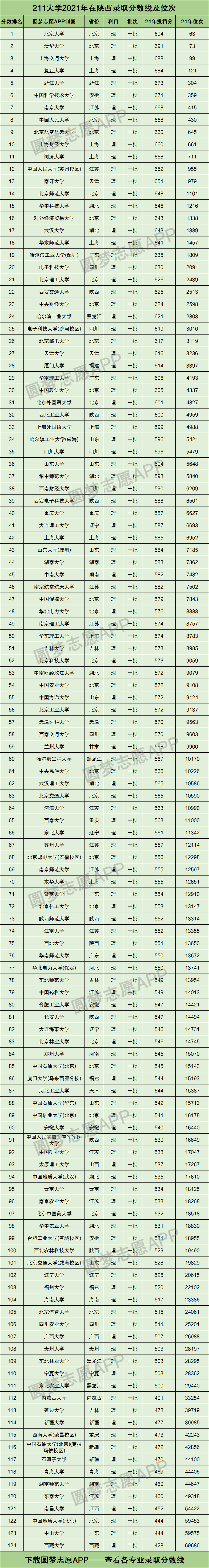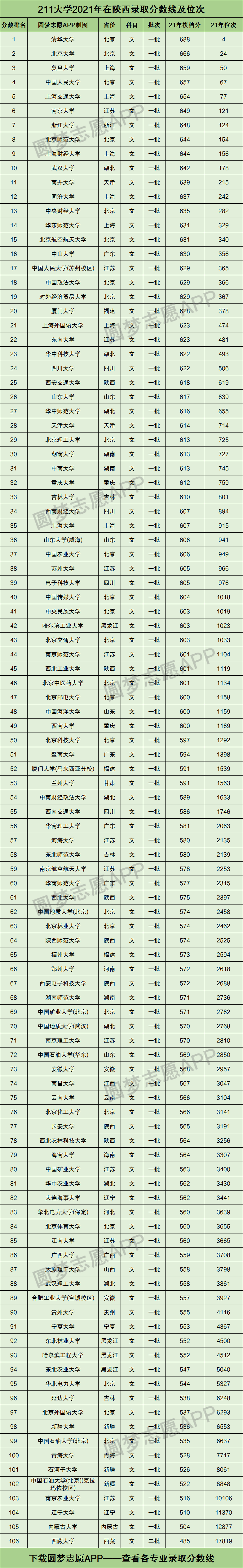下图为2021年211大学在陕西文科录取分数线及位次: