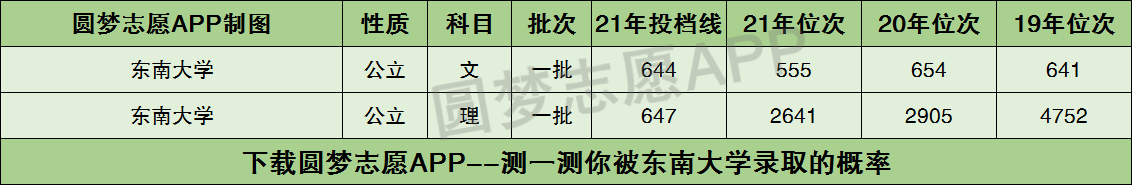 根据上图可知,东南大学2021年在安徽省本科一批文科的投档分数线为644分,理科投档分数线为647分。