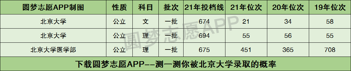 根据上图可知,北京大学2021年在安徽省本科一批文科的投档分数线为674分,理科投档分数线为694分;北京大学医学部在安徽理科的投档分数线为675分。