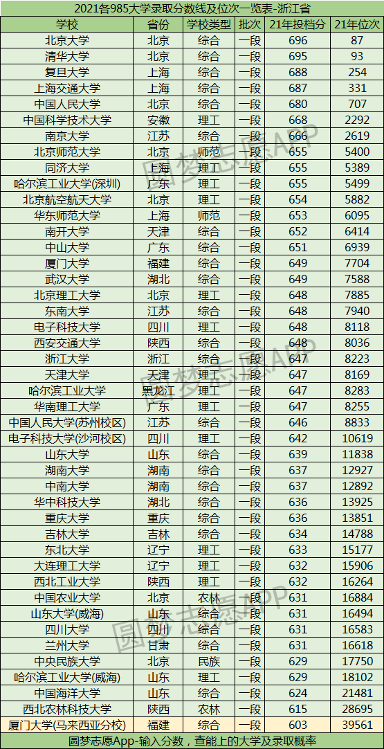 2021年985大学在浙江省最低录取分数线是603分,即浙江省考生2022年最低得考603分,全省排名前39561名,才有机会上985大学。