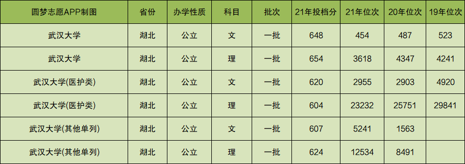 根据上图可知,武汉大学2021年在河南省文科的投档分数线为648分,理科的投档分数线为654分。而武汉大学(医护类)2021年在河南省文科的投档分数线为620分,理科投档分数线为604分。武汉大学(其他单列)2021年在河南省文科的投档分数线为607分,理科投档分数线为624分。