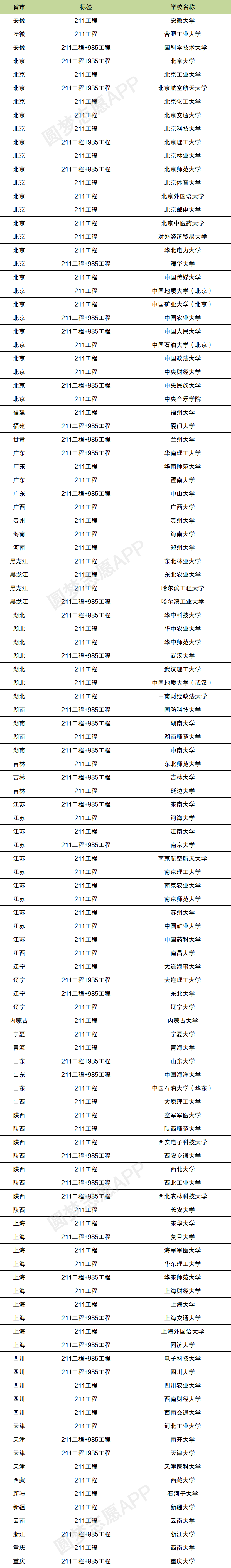985、211工程如今已经被双一流项目取代了,所以名单不再会发生变化。其中985高校共计39所,211工程共计115所。需要注意的是,教育部公布的211大学名单仅有112所,但随着高校的发展,中国石油大学分为了中国石油大学(北京)和中国石油大学(北京),中国矿业大学增加了一所中国矿业大学(北京),中国地质大学分为了中国地质大学(武汉)和中国地质大学(北京)。华北电力大学的保定校区为分校区,并非不同的高校。以下为211985大学名单及所在城市汇总: