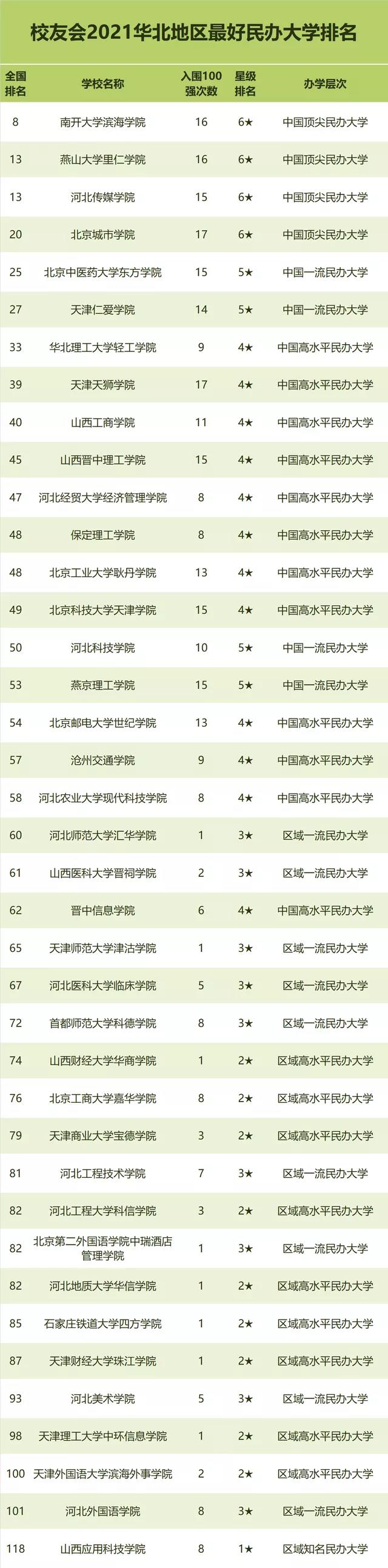 在最新2021中国最好民办大学排名中,武昌首义学院、珠海科技学院、西安欧亚学院分列2021中国最好民办大学排名第一。南开大学滨海学院、燕山大学里仁学院、河北传媒学院、北京城市学院、北京中医药大学东方学院位列2021校友会华北地区最好民办大学排名前五强。