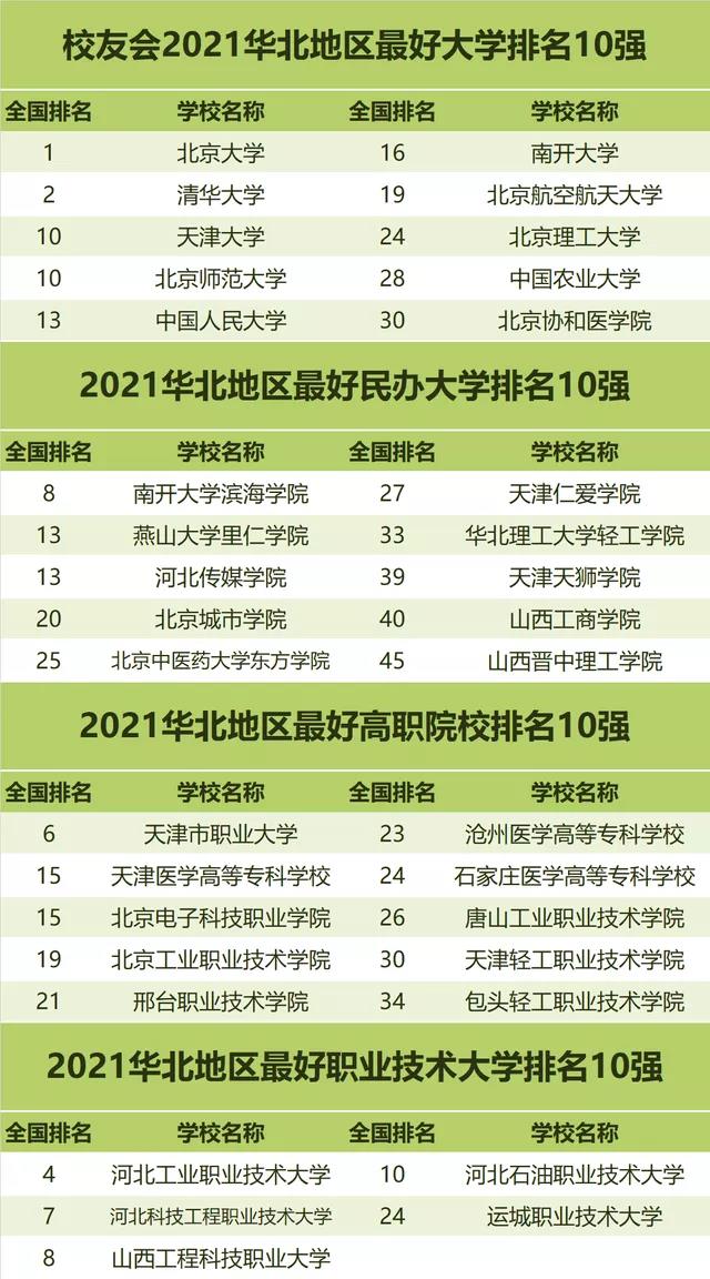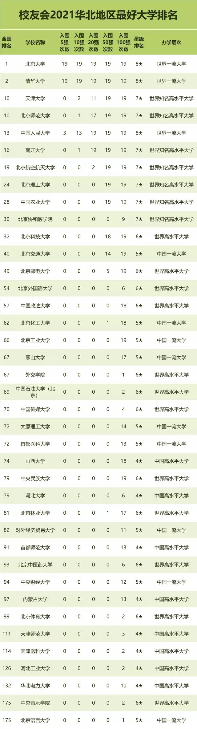 榜单显示,北京大学、清华大学问鼎校友会2021中国最好大学排名冠亚军,北大15次赢得中国大学第一,清华4次问鼎全国冠军,荣膺“2021中国最好大学”桂冠。北京大学、清华大学、天津大学、北京师范大学、中国人民大学位列2021校友会华北地区最好大学排名前五名。