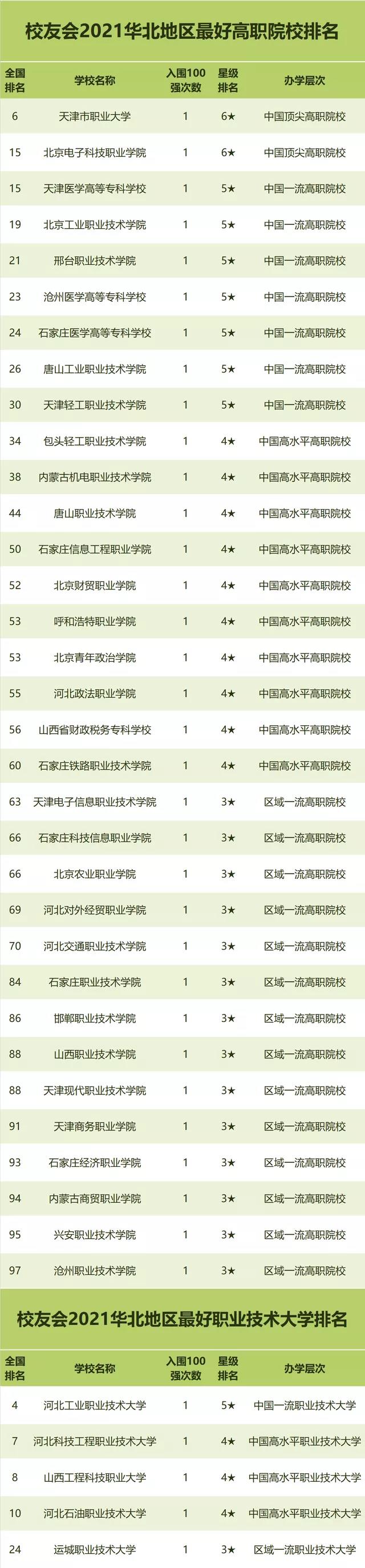 在最新2021中国最好高职院校排名中,广东轻工职业技术学院、深圳职业技术学院、山东商业职业技术学院分列2021中国最好高职院校排名榜首。天津市职业大学、天津医学高等专科学校、北京电子科技职业学院、北京工业职业技术学院、邢台职业技术学院位列2021校友会华北地区最好高职院校排名前五名。
