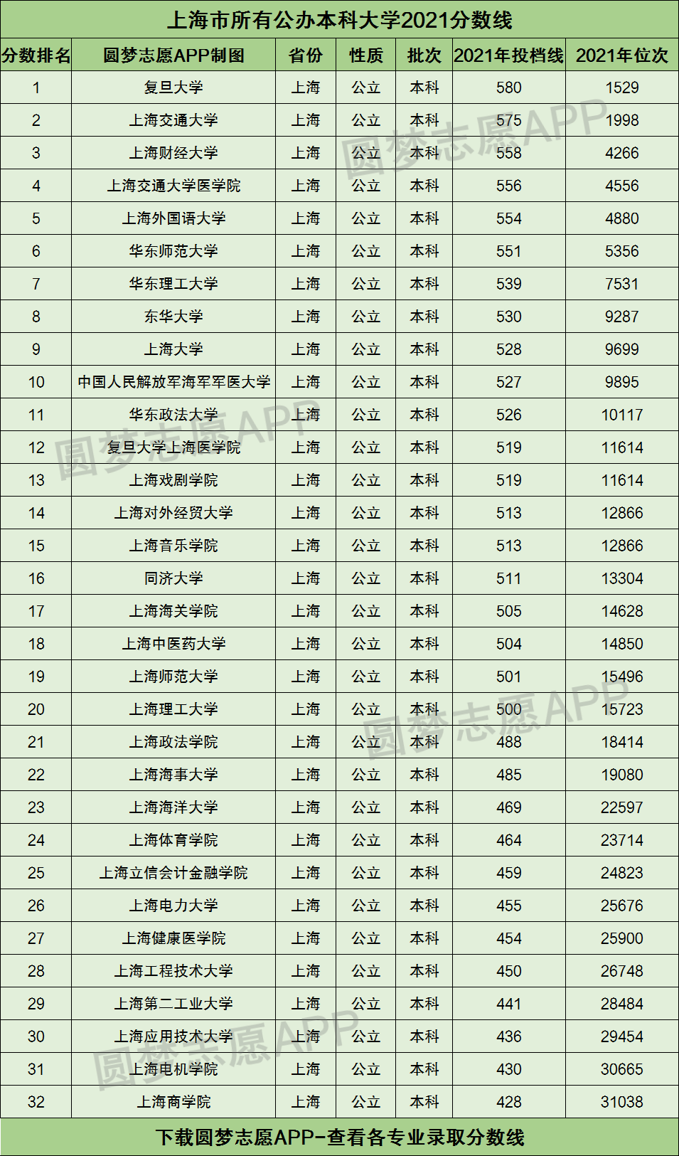 根据下图可知,上海市内的公办本科大学2021年在上海高考的最低分数线为428分,对应的大学为上海商学院。而上海市2021年高考本科线为400分,这也就意味着如果你想读上海市内的公立本科大学,那么至少得超过本科线28分才行!