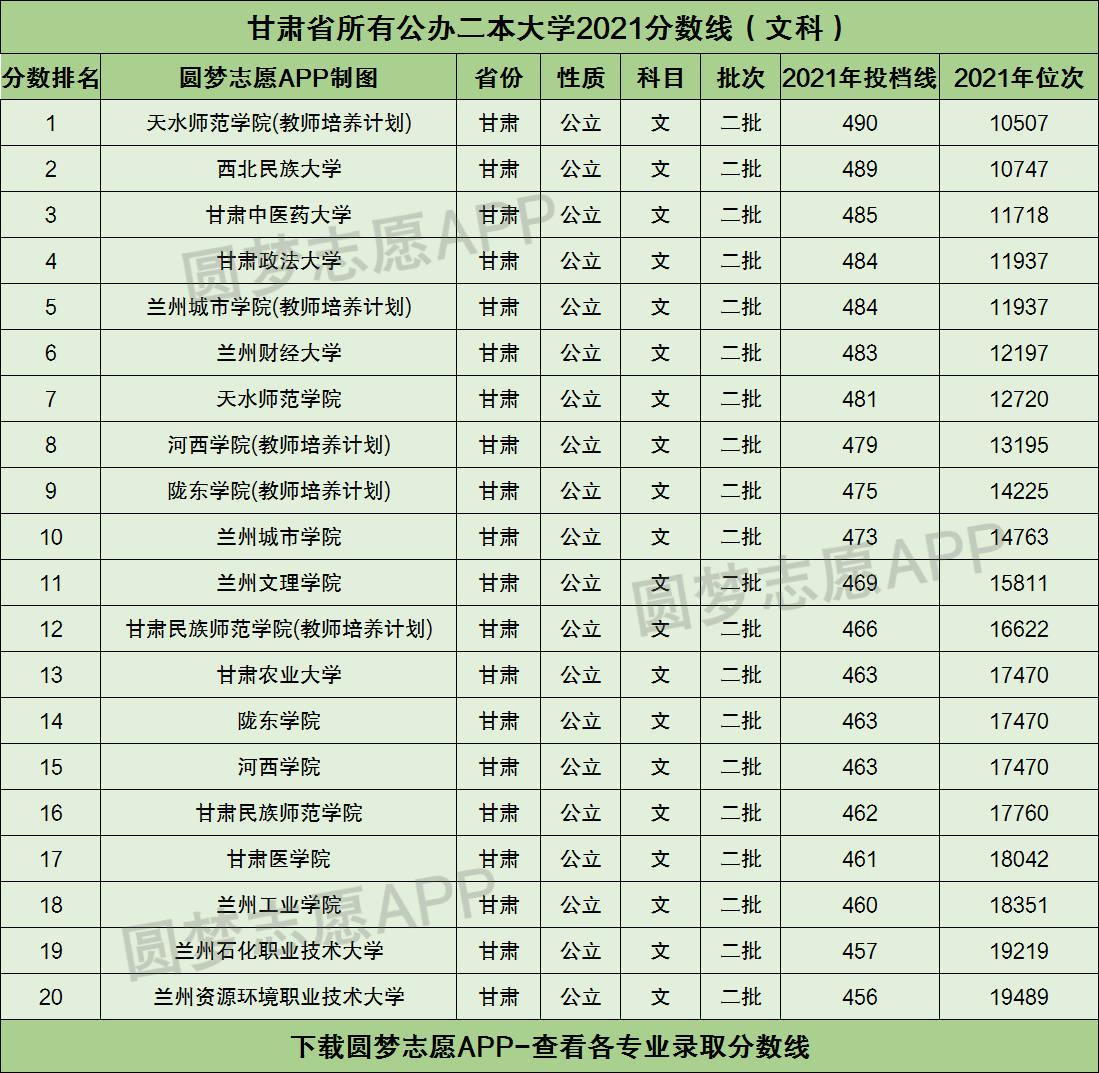 根据下图可知,甘肃省内的公办二本大学2021年在甘肃高考文科的最低分数线为456分,对应的大学为兰州资源环境职业技术大学。而甘肃省2021年高考文科二本线为432分,这也就意味着如果你想留在甘肃省内读公立二本大学,那么高考成绩至少要超过二本线24分才行!