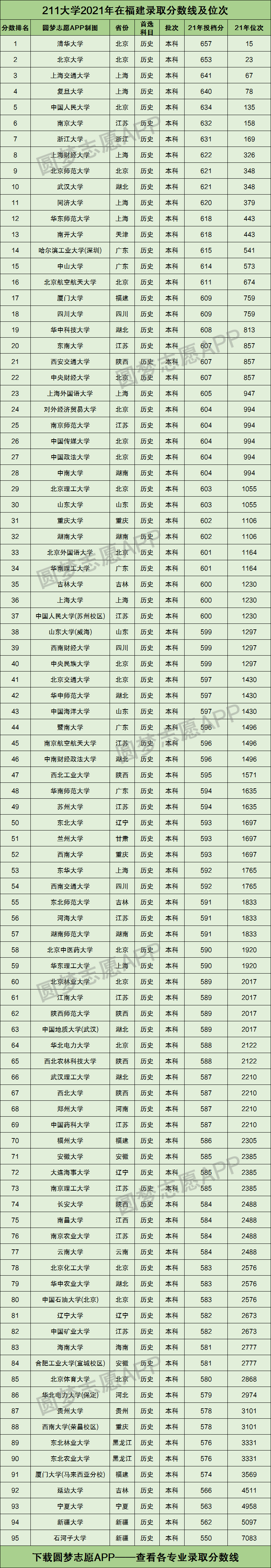 下图为2021年211大学在福建首选历史录取分数线及位次: