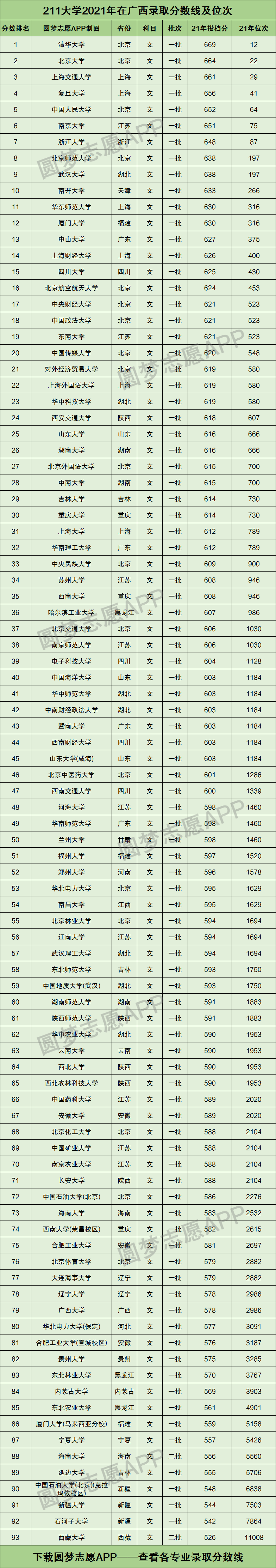 下图为2021年211大学在广西文科录取分数线及位次:
