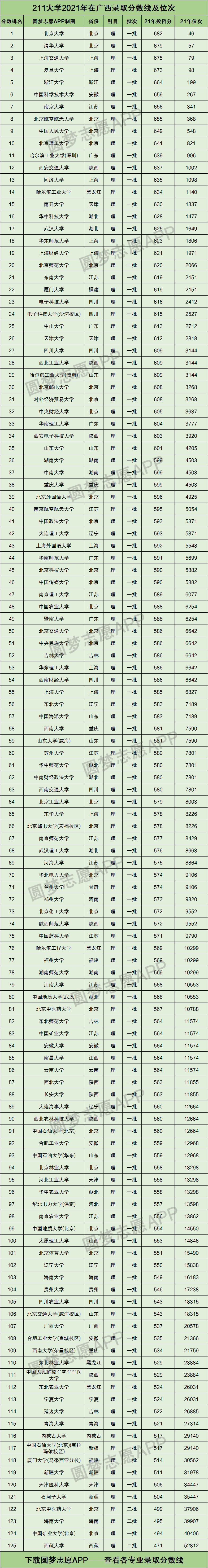 一、2021年211大学在广西录取位次(理科)