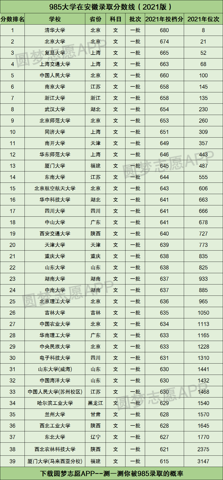 下图为为大家整理的985大学2021年在安徽省文科的招生分数线以及位次排名汇总。
