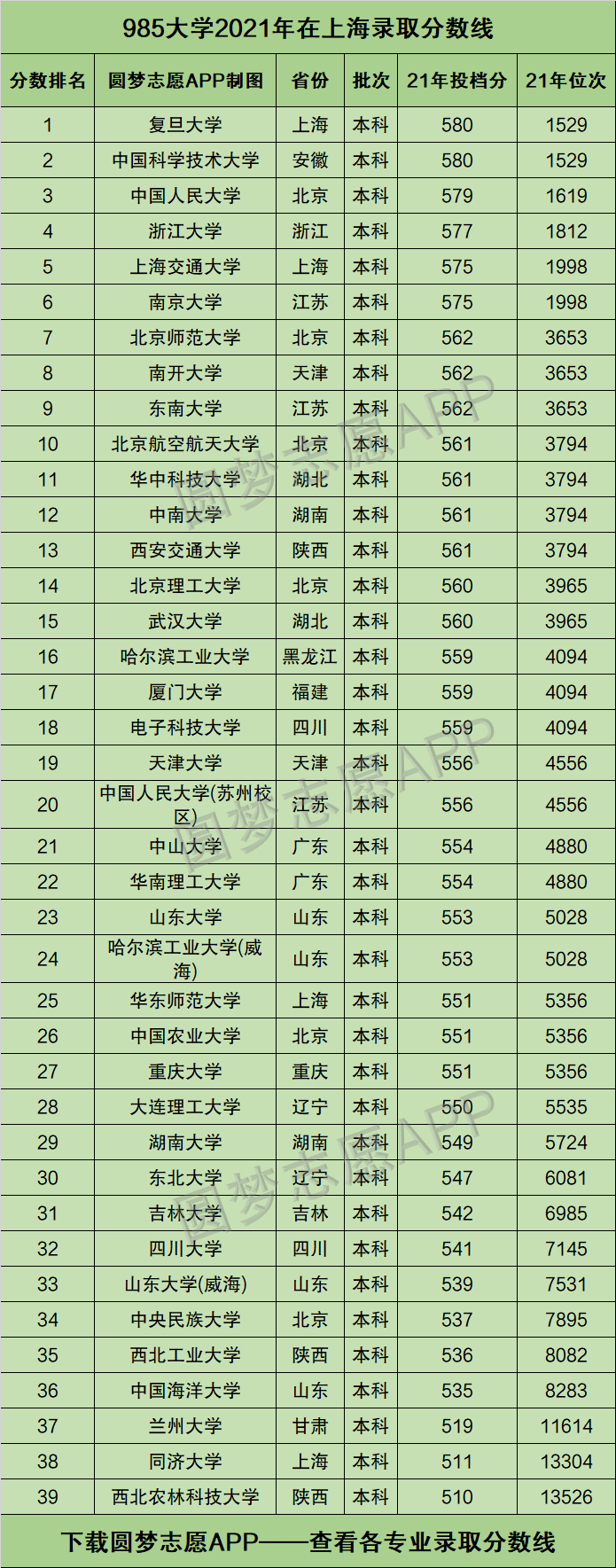 其中,在上海录取位次最高的985大学为:复旦大学。只有上海市高考排名在1529名以内的考生才有机会被这所大学录取。