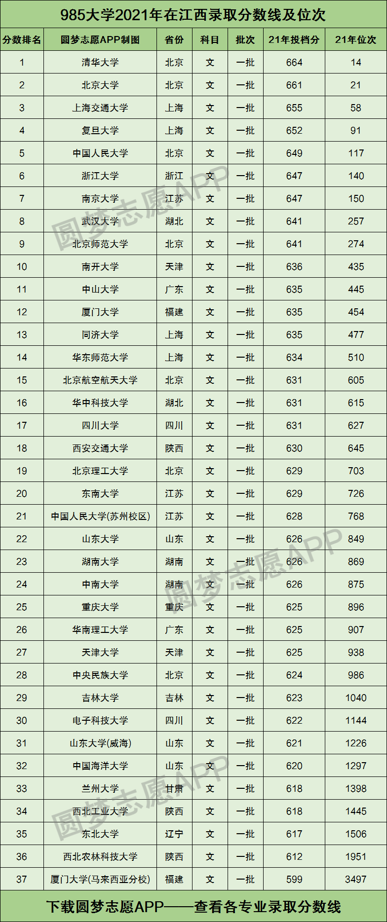 下图为2021年985大学在江西文科录取分数线及位次: