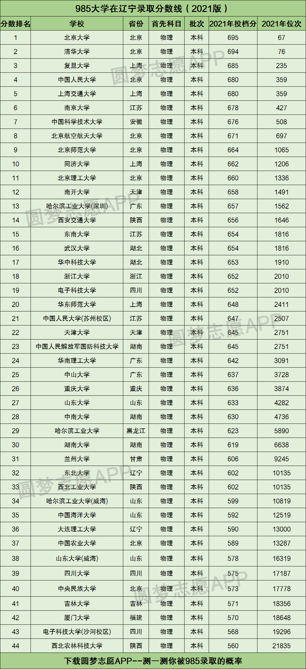 一、985大学在辽宁录取分数线2021年本科(首选物理科目)