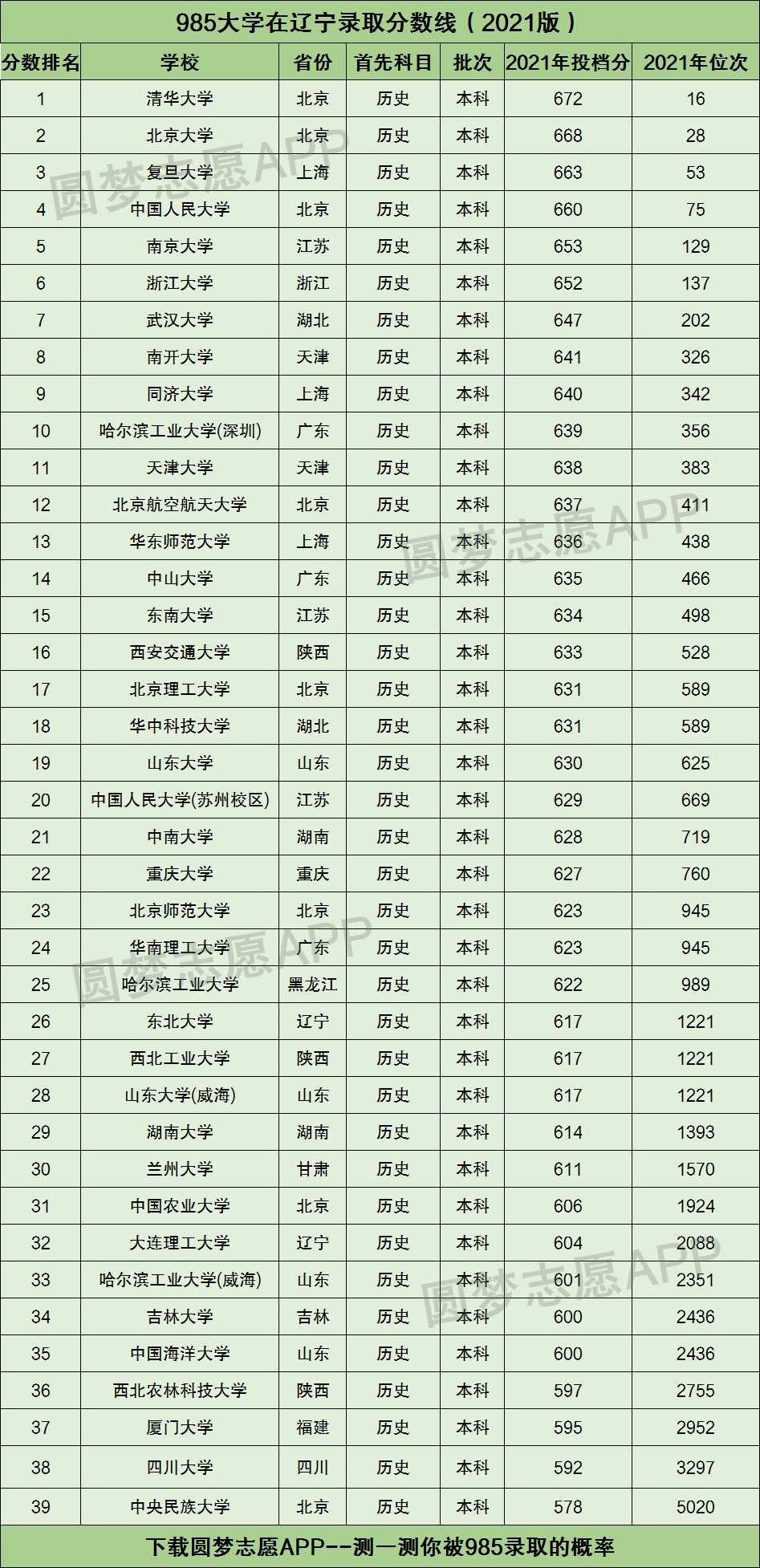 二、985大学在辽宁录取分数线2021年本科(首选历史科目)