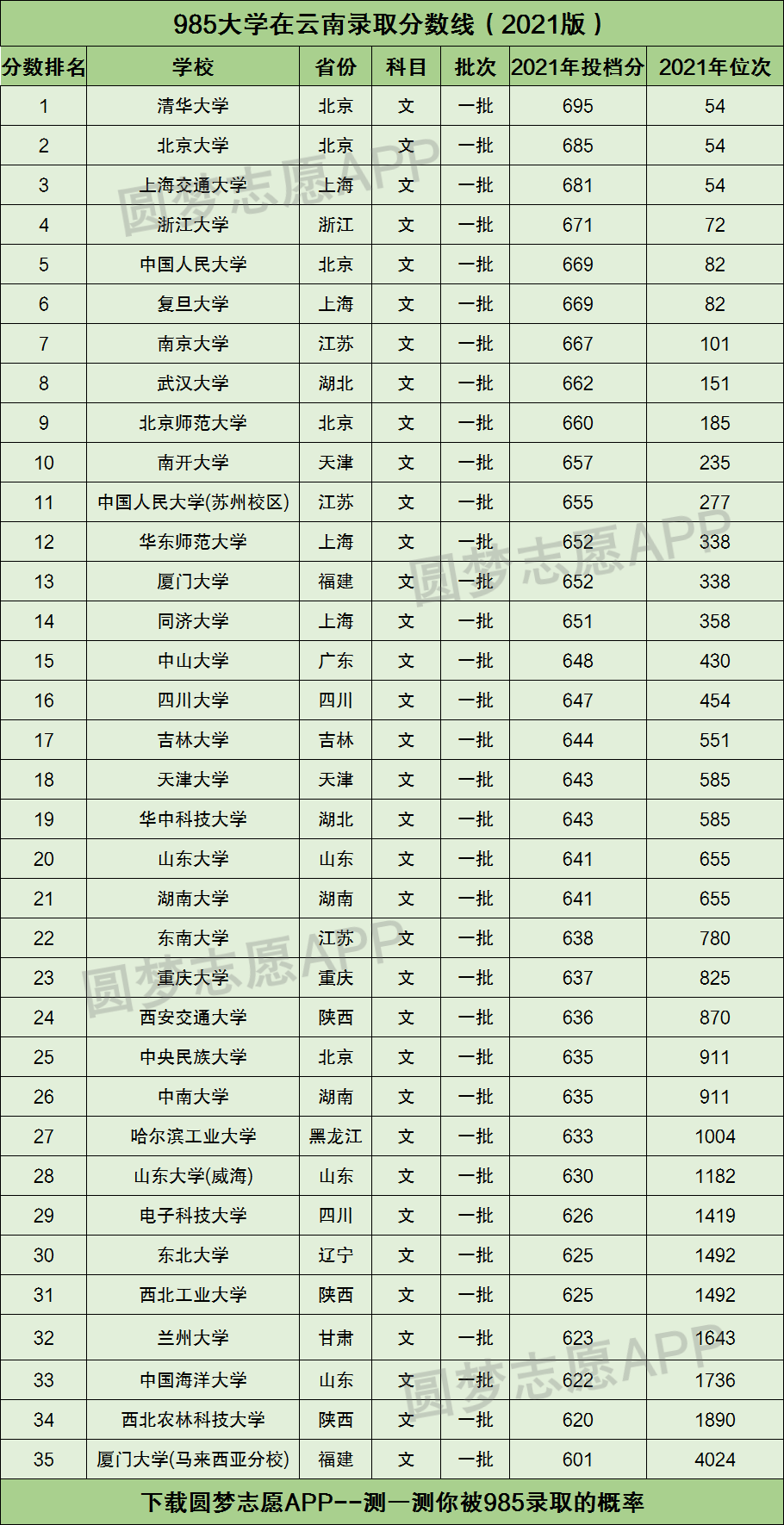 下图为为大家整理的985大学2021年在云南省文科的招生分数线以及位次排名汇总。