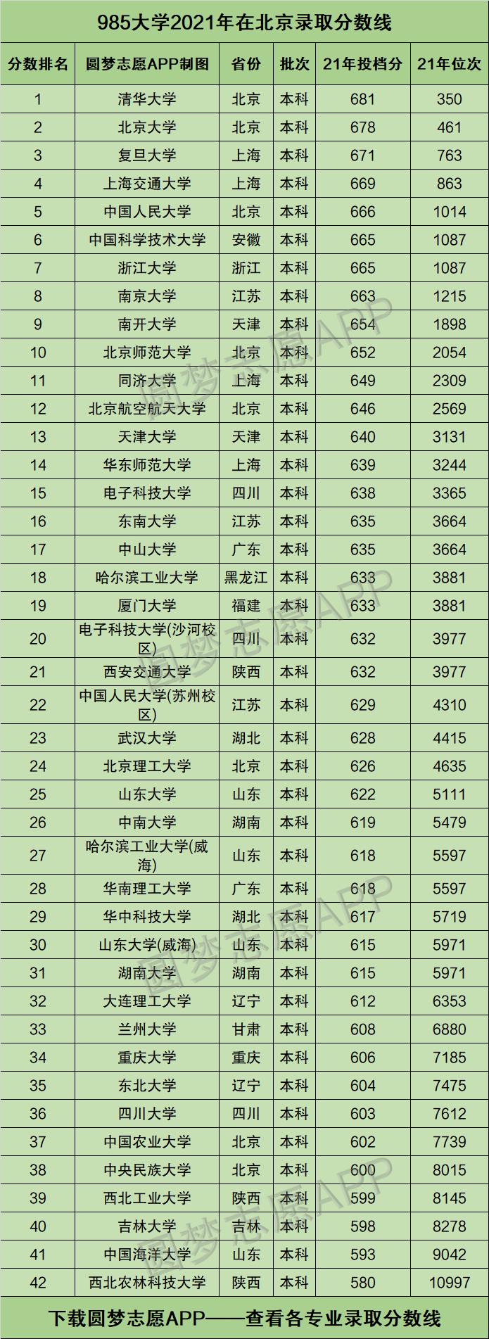 本文将为大家奉上全国所有985大学2021年在北京市的录取分数线及位次排名,希望能帮助北京市内想要读985的同学成功拿到录取通知书!