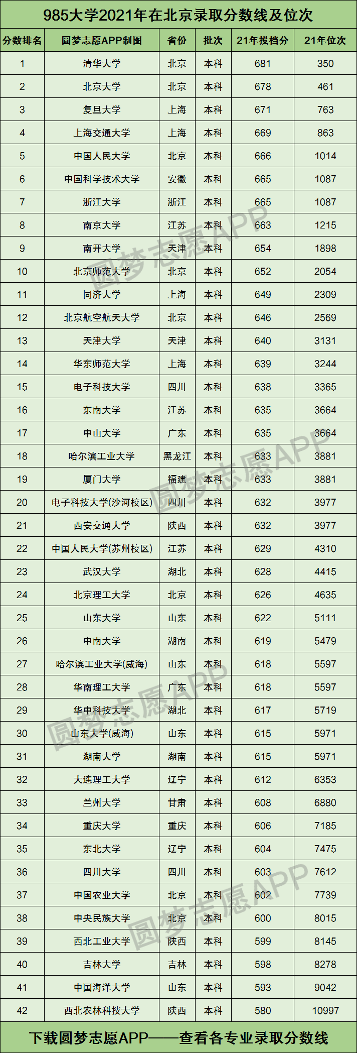 本文将为大家奉上全国所有985大学2021年在北京市的录取分数线及位次排名,希望能帮助北京市内想要读985的同学成功拿到录取通知书!