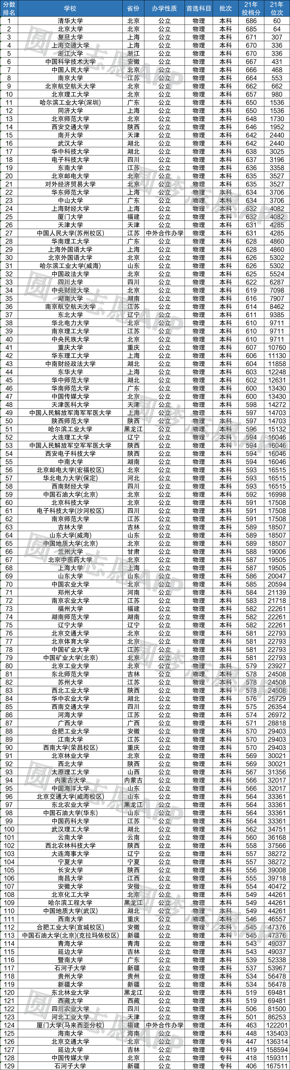 2021年收分最高的大学为清华大学、北京大学、复旦大学、上海交通大学、浙江大学,2021年它们最低投档分在670~686分之间,最低位次在60~336名之间。也就是说河北考生要在全省前336名,才有机会被这几所大学所录取,可见,这几所大学无疑是河北省首选物理的考生最难考取的大学。