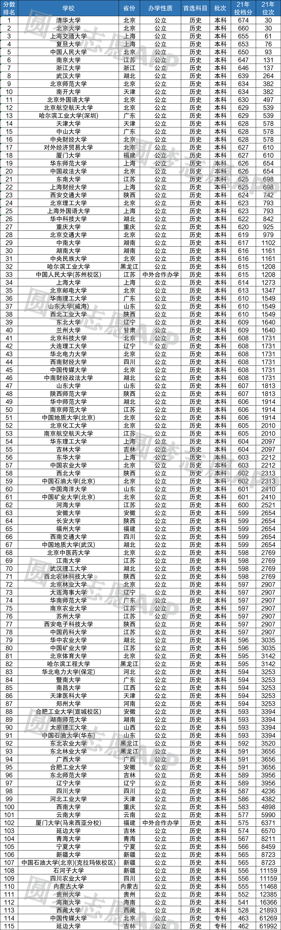 2021年收分最高的大学为清华大学、北京大学、上海交通大学、复旦大学、中国人民大学,2021年它们最低投档分为650~674分,最低位次在30~93名之间,也就是说河北考生要在全省前100名,才有机会被这几所大学所录取,可见,这几所大学无疑是河北省首选历史的考生最难考取的大学。