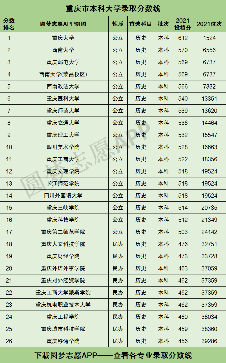 根据重庆市考试院公布的数据,按照首选历史投档分数线的高低排序,为大家整理出了下图这份重庆市内的所有本科大学首选历史录取分数线排名榜单: