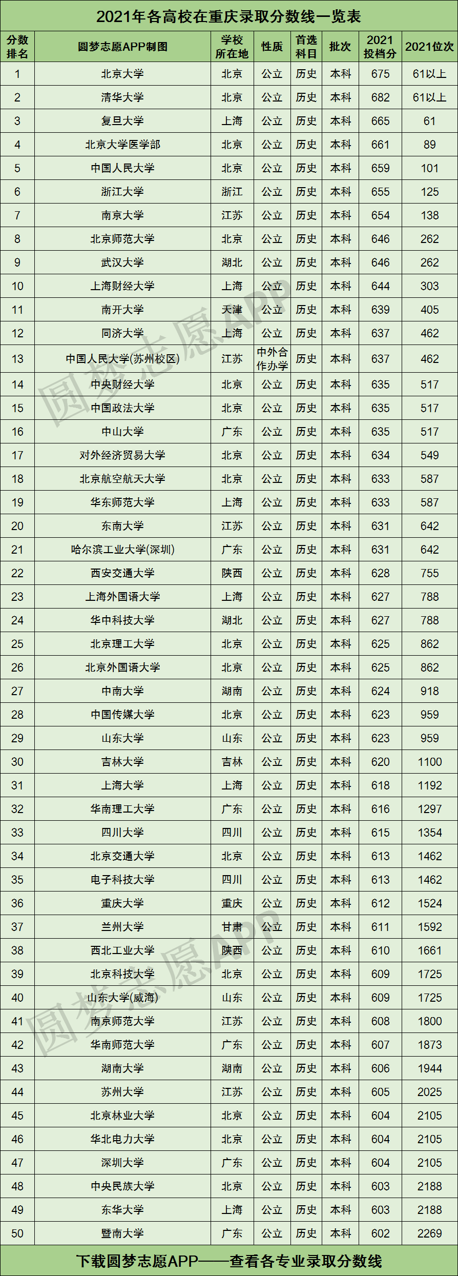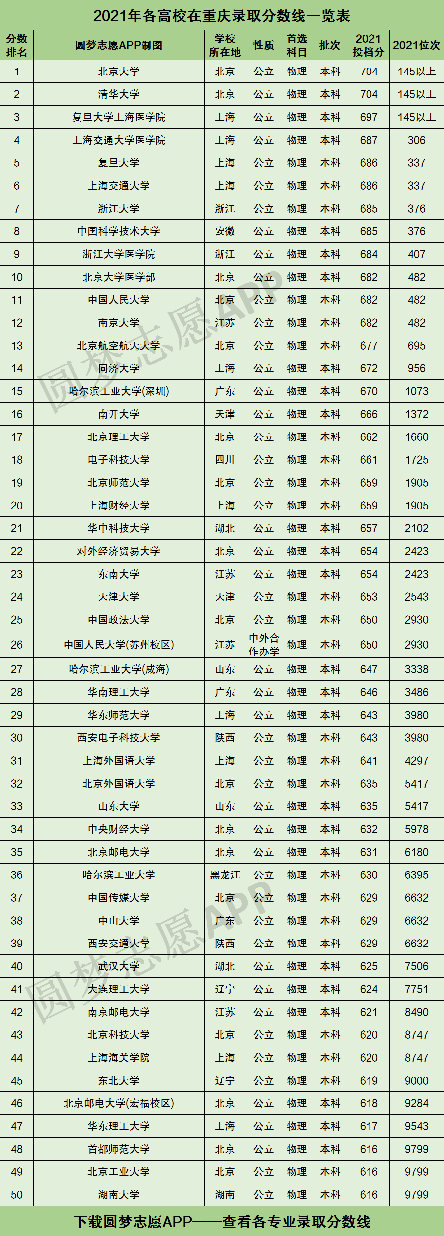 对于不想留在重庆市读大学的高三同学来说,全国各地的高校在重庆市的录取分数线则才是一份最有价值的参考资料。不过本文由于篇幅有限,将仅为大家展示2021年各高校在重庆录取分数线最高的前50所大学,如果你想查看全国近3000所大学在重庆市的录取分数线排名,可以在中直接EXCEL表格。