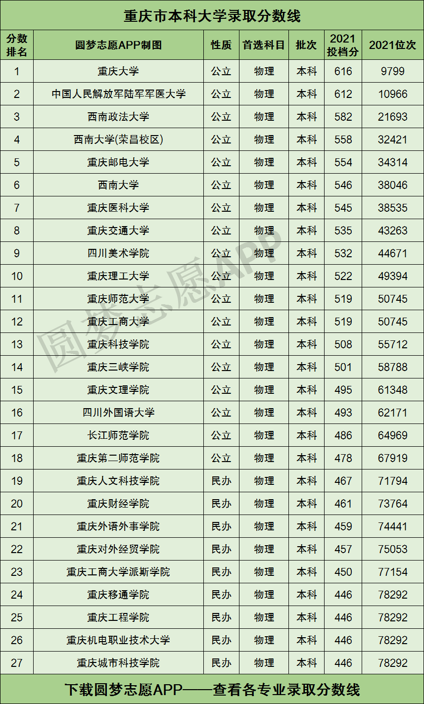 根据考试院的数据,为大家整理了重庆市内所有本科大学2021年高考首选物理的投档分数线及位次排名。具体见下图: