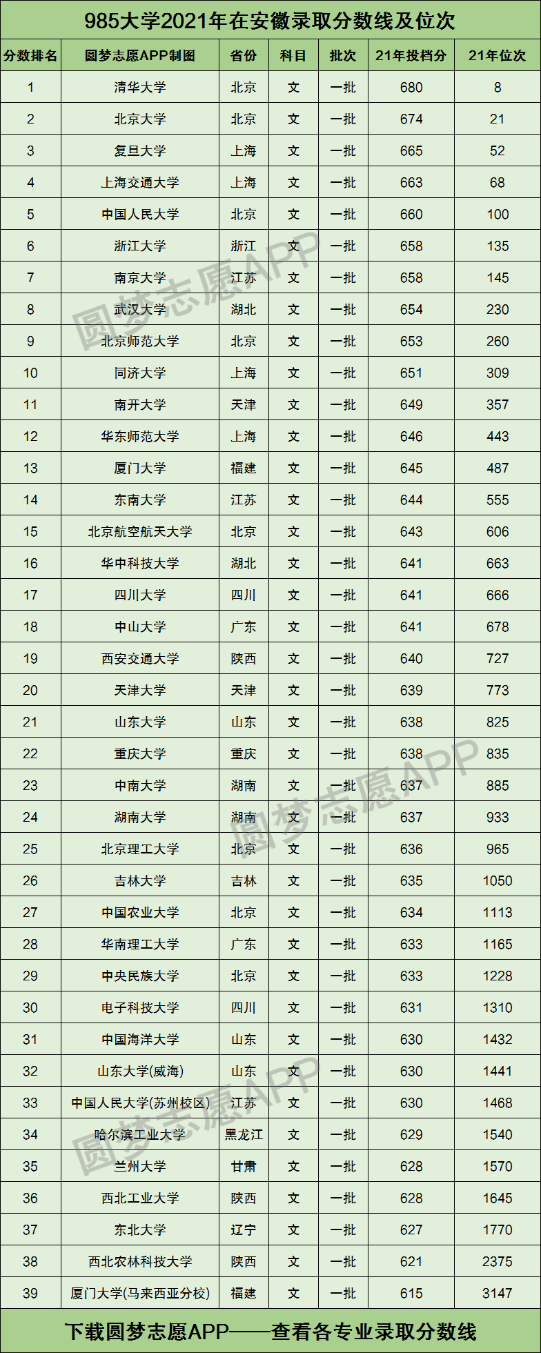 下图为2021年985大学在安徽文科录取分数线及位次: