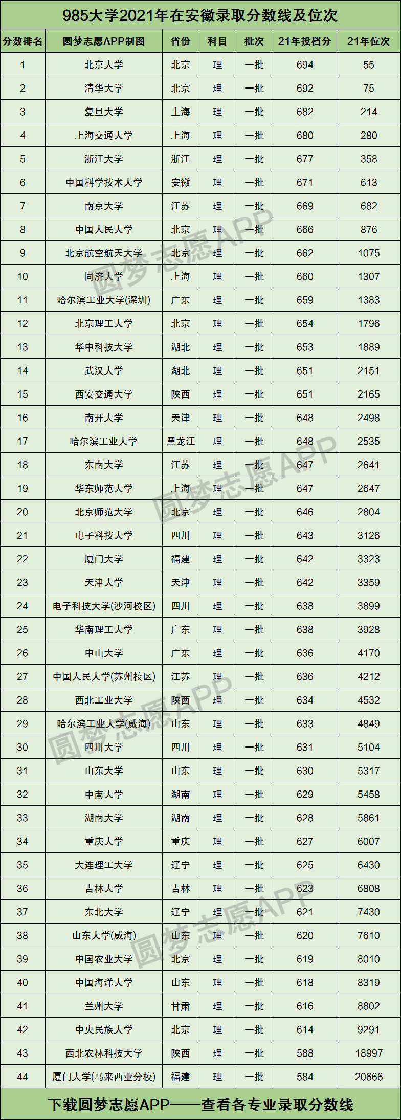 本文将为大家奉上全国所有985大学2021年在安徽省文科、理科的录取分数线及位次排名,希望能帮助安徽省内想要读985的同学成功拿到录取通知书!