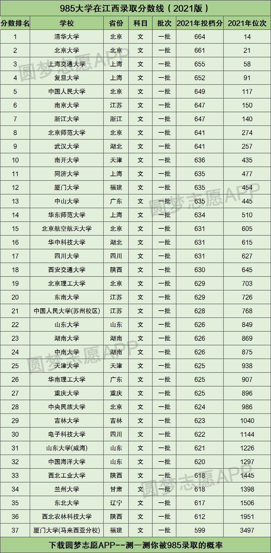 下图为为大家整理的985大学2021年在江西省文科的招生分数线以及位次排名汇总。