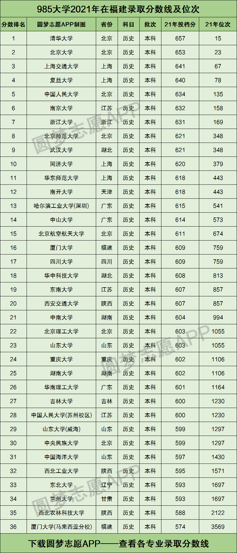 下图为2021年985大学在福建首选历史录取分数线及位次: