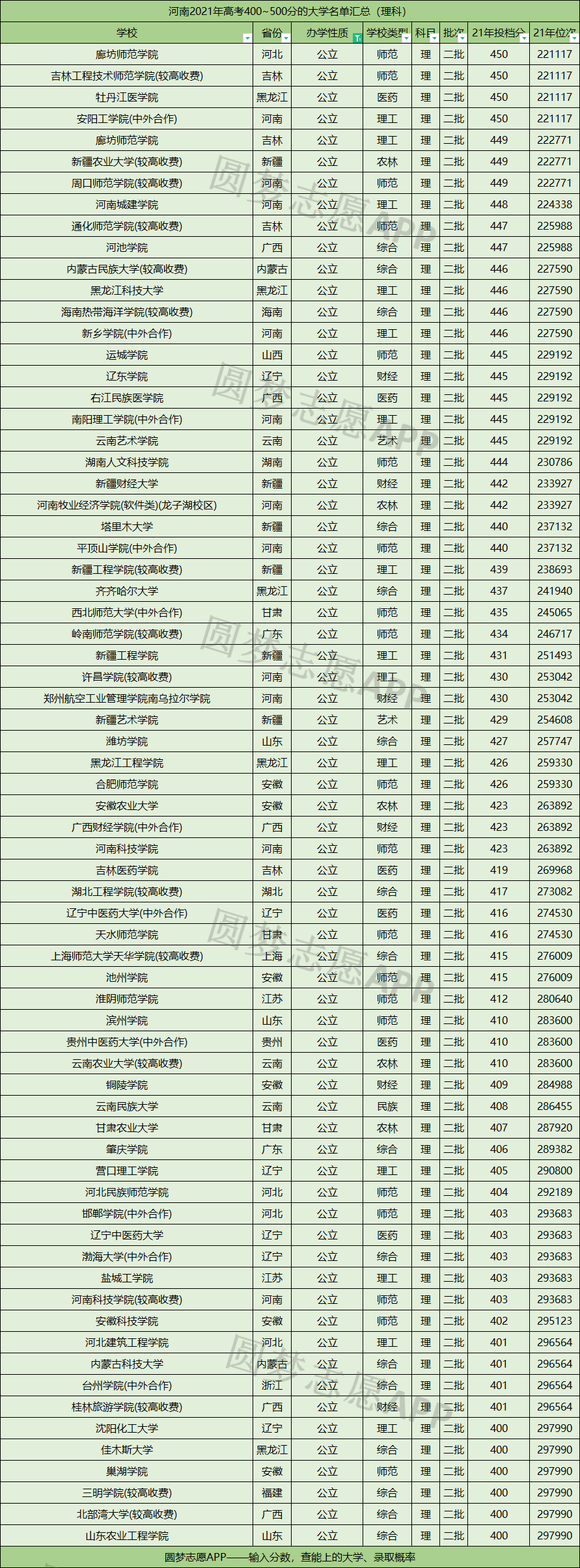 2021年河南文科二本线为466分,因此没有400~450分的本科大学。2021年在河南省理科录取分数线为400~500分的公办本科大学一共有70所,包括廊坊师范学院(450分)、牡丹江医学院(450分)、河池学院(447分)等,河南高考400~500分能上哪所大学理科具体名单如下: